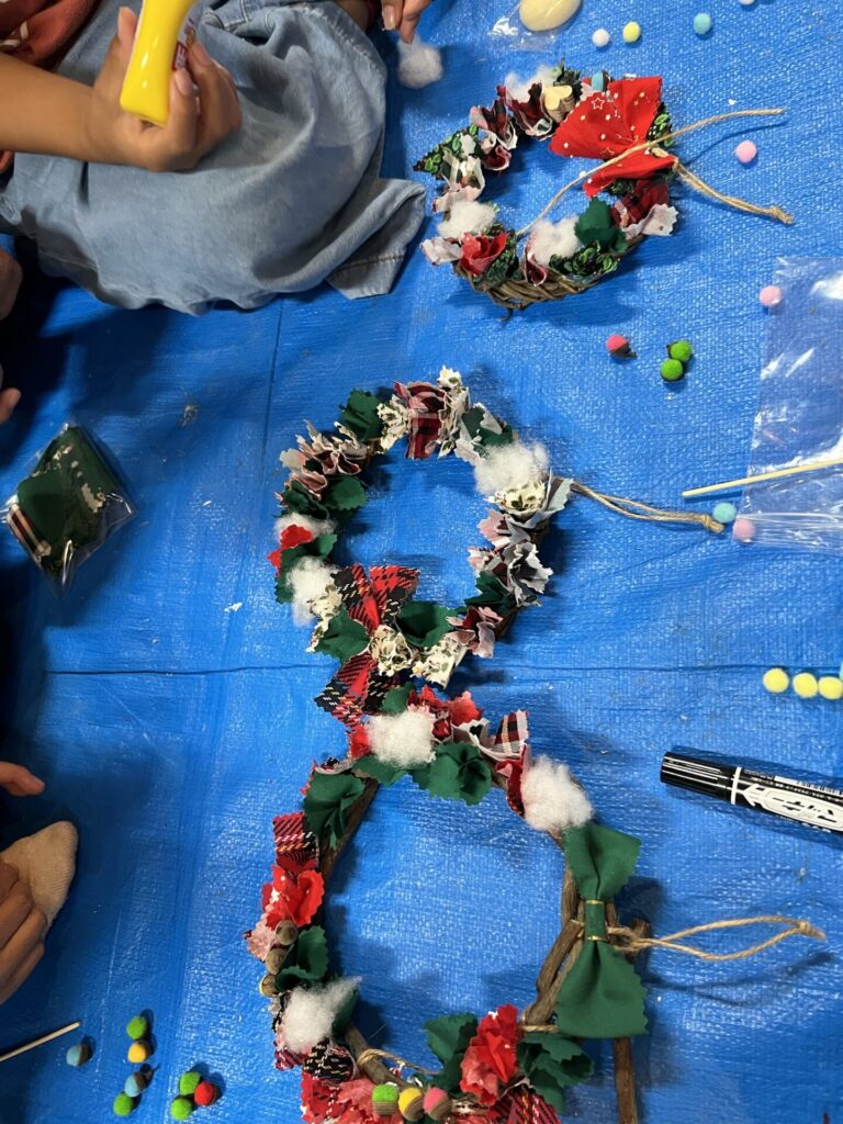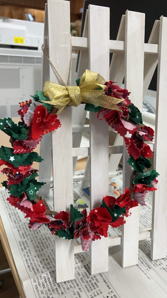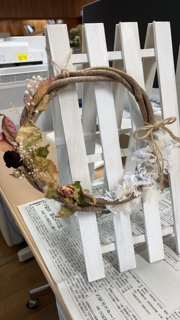 今年から、「松ぼっくりツリー」からかずらリースに変更しました。新しいことを始めるのはとても大変で勇気のいる事で、まずは試作から〜